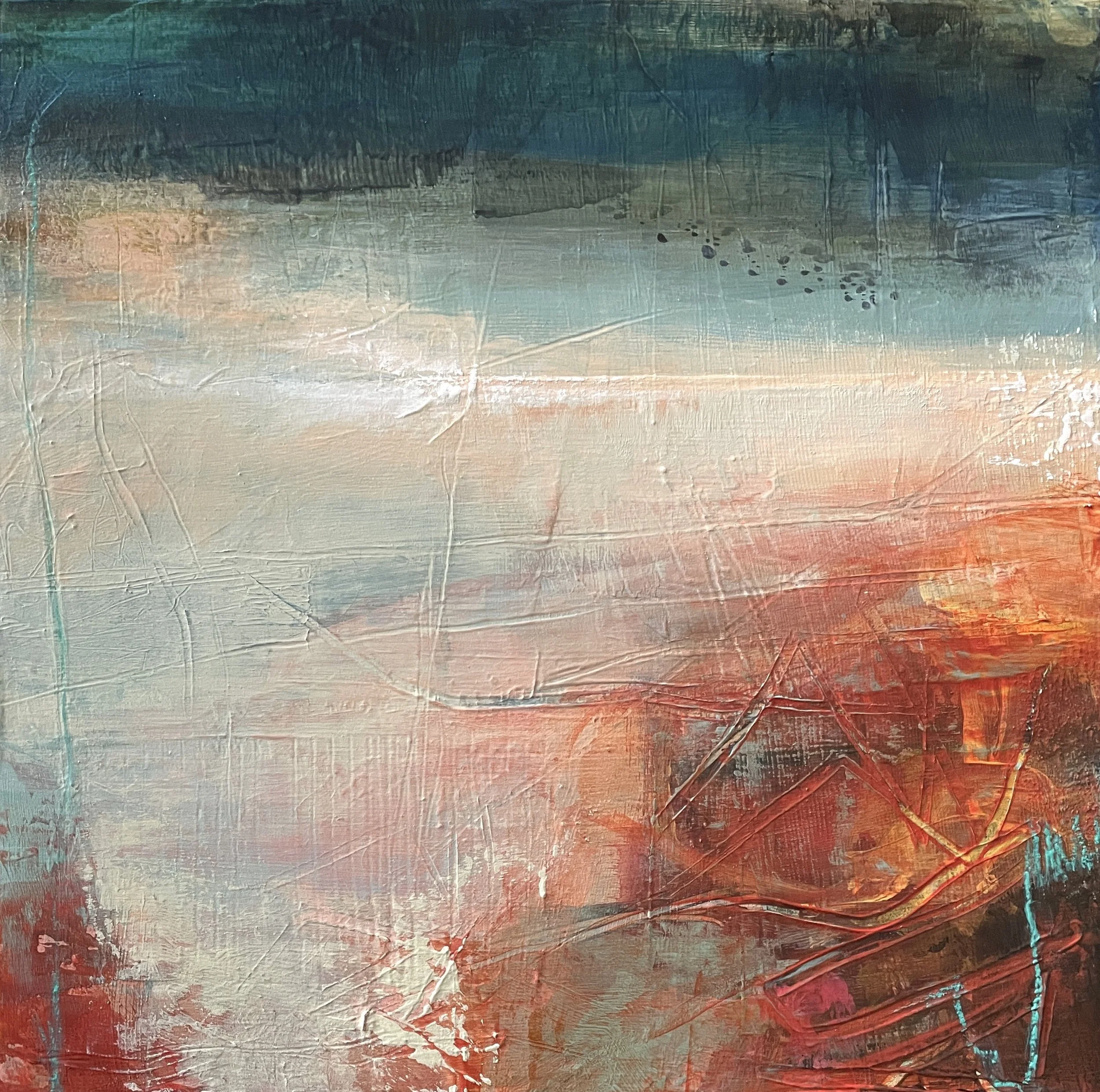 Acrylic and mixed media on cradled wood panel set in a grey tray frame.